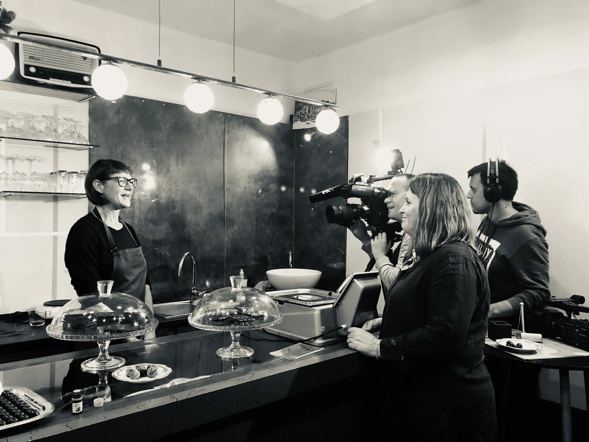 Isabelle being interviewed at the chocolate shop.