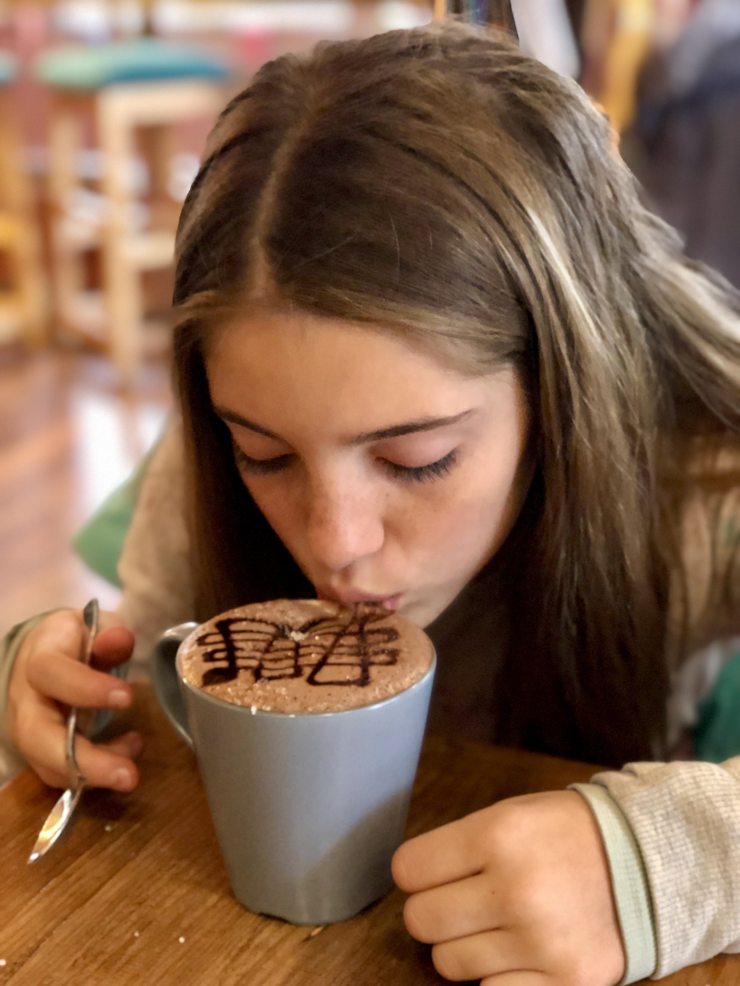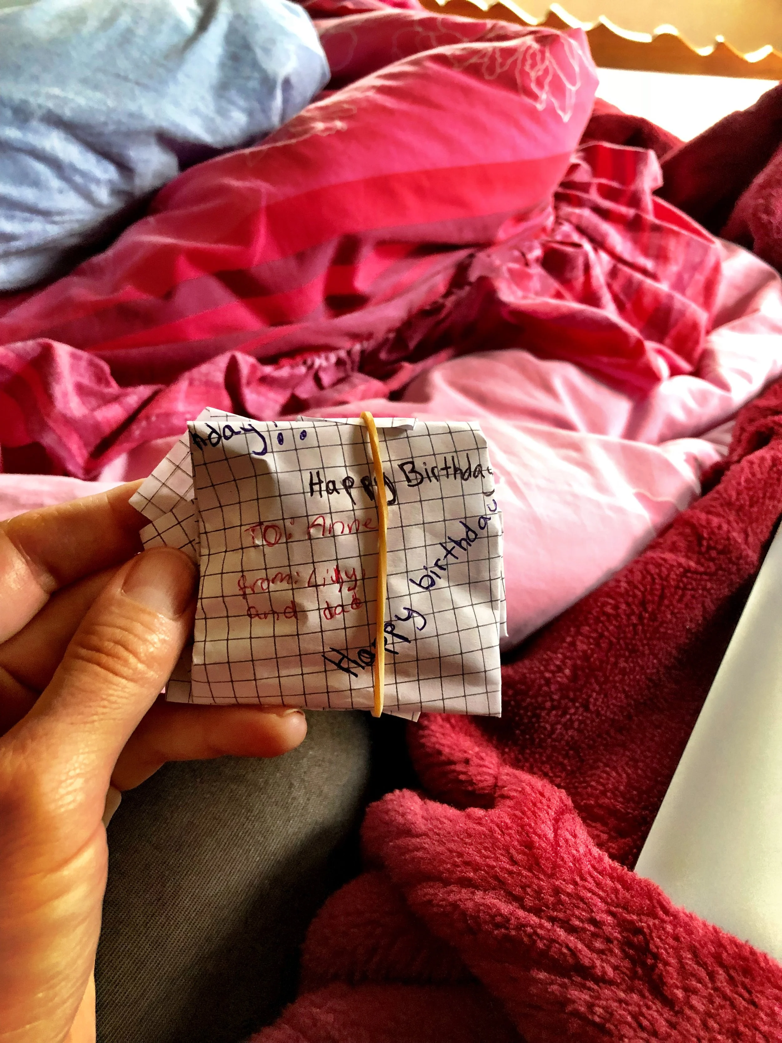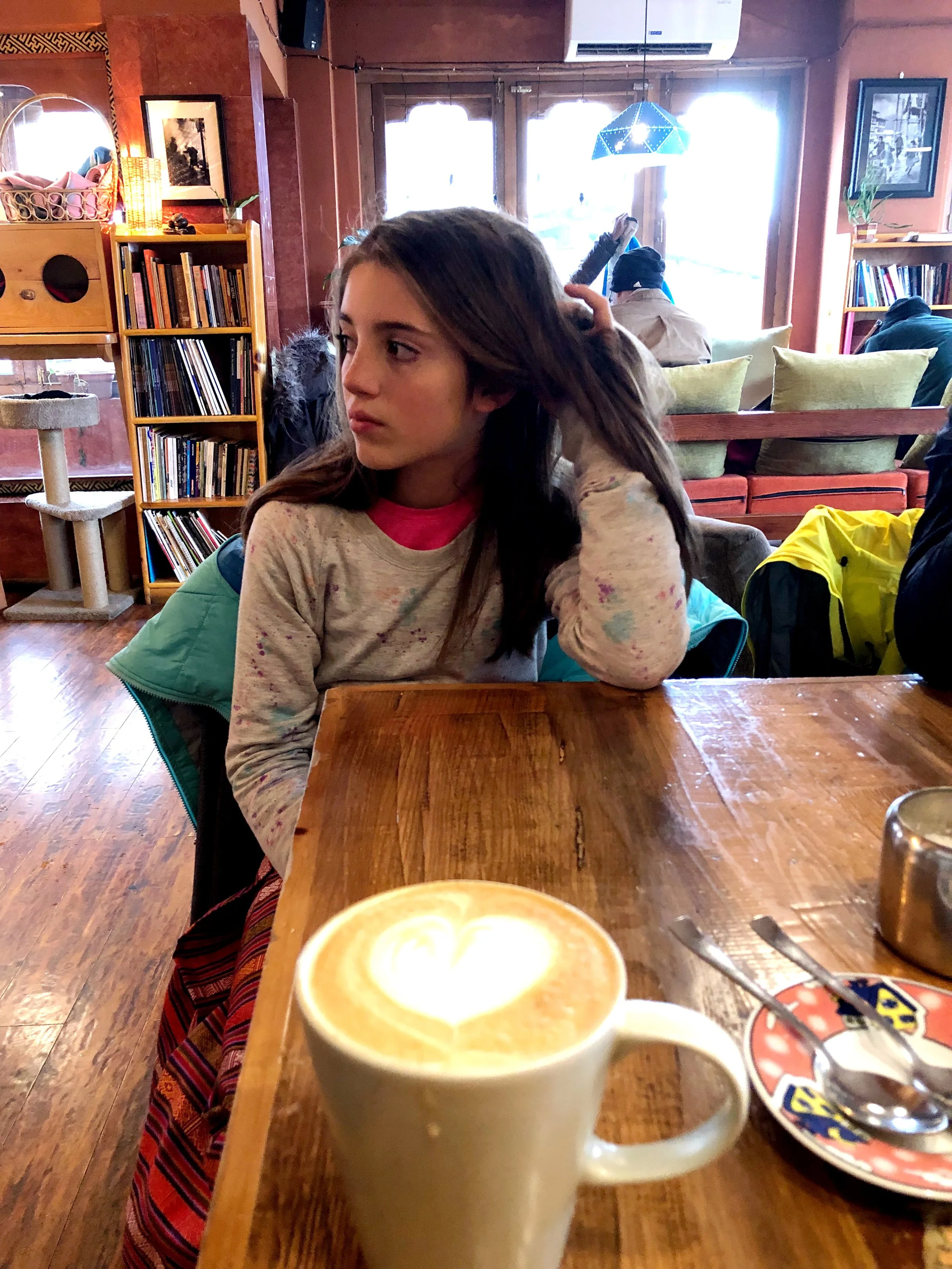 I had been saying how it did not feel like my birthday because it was not cold, and there was no snow, so when the girls saw what was happening outside they jumped into our bed, full of excitement that I got my “birthday wish” and how fun it was. As we really have no paper and can take very little with us, we curled in bed, each of them sending me their beautiful electronic cards and gave me the gift of a new pair of earring. We headed to the local cafe for breakfast and coffee.