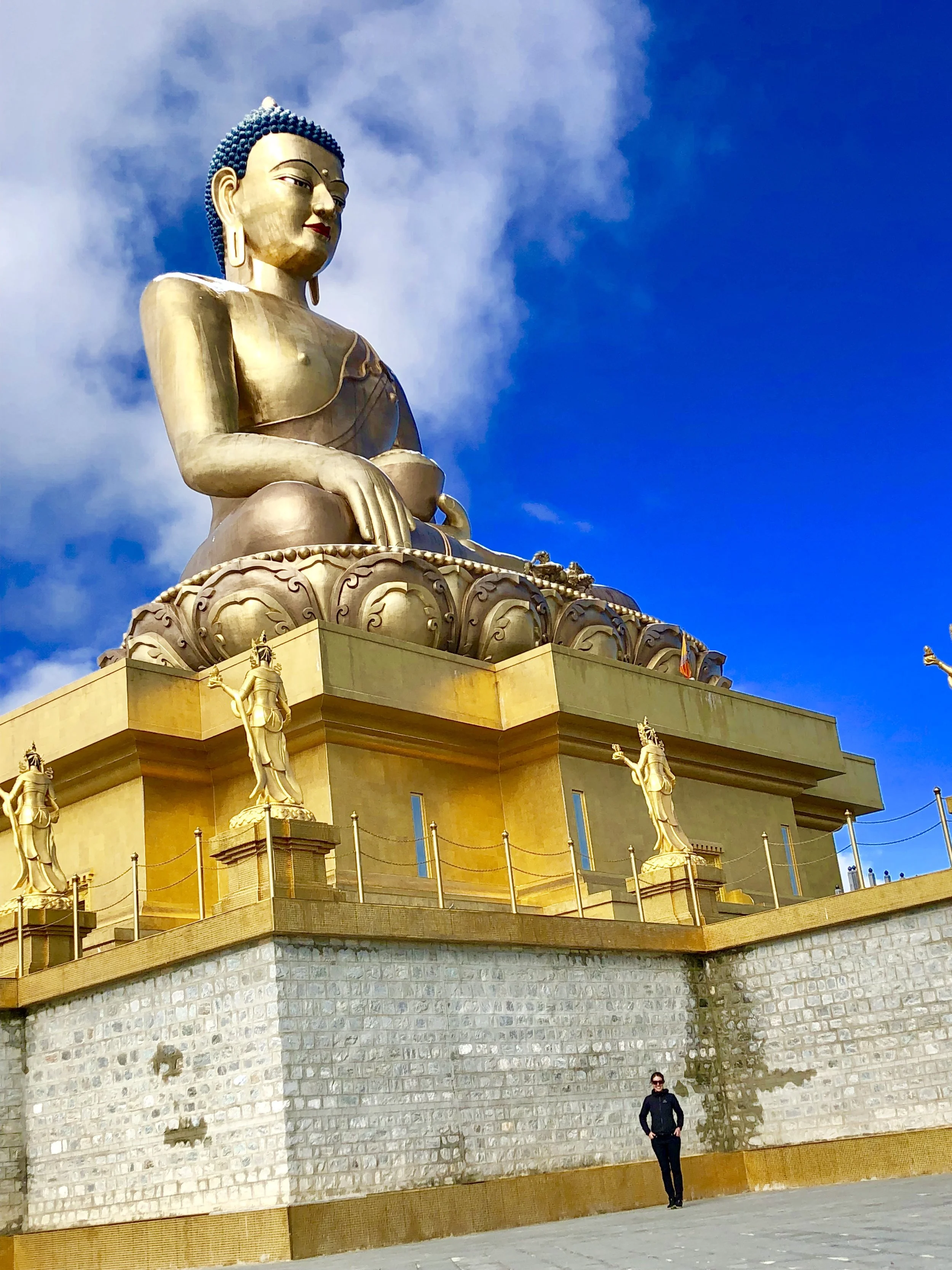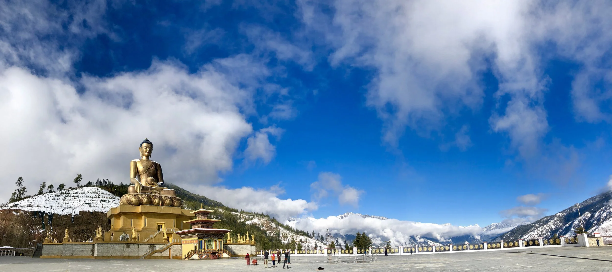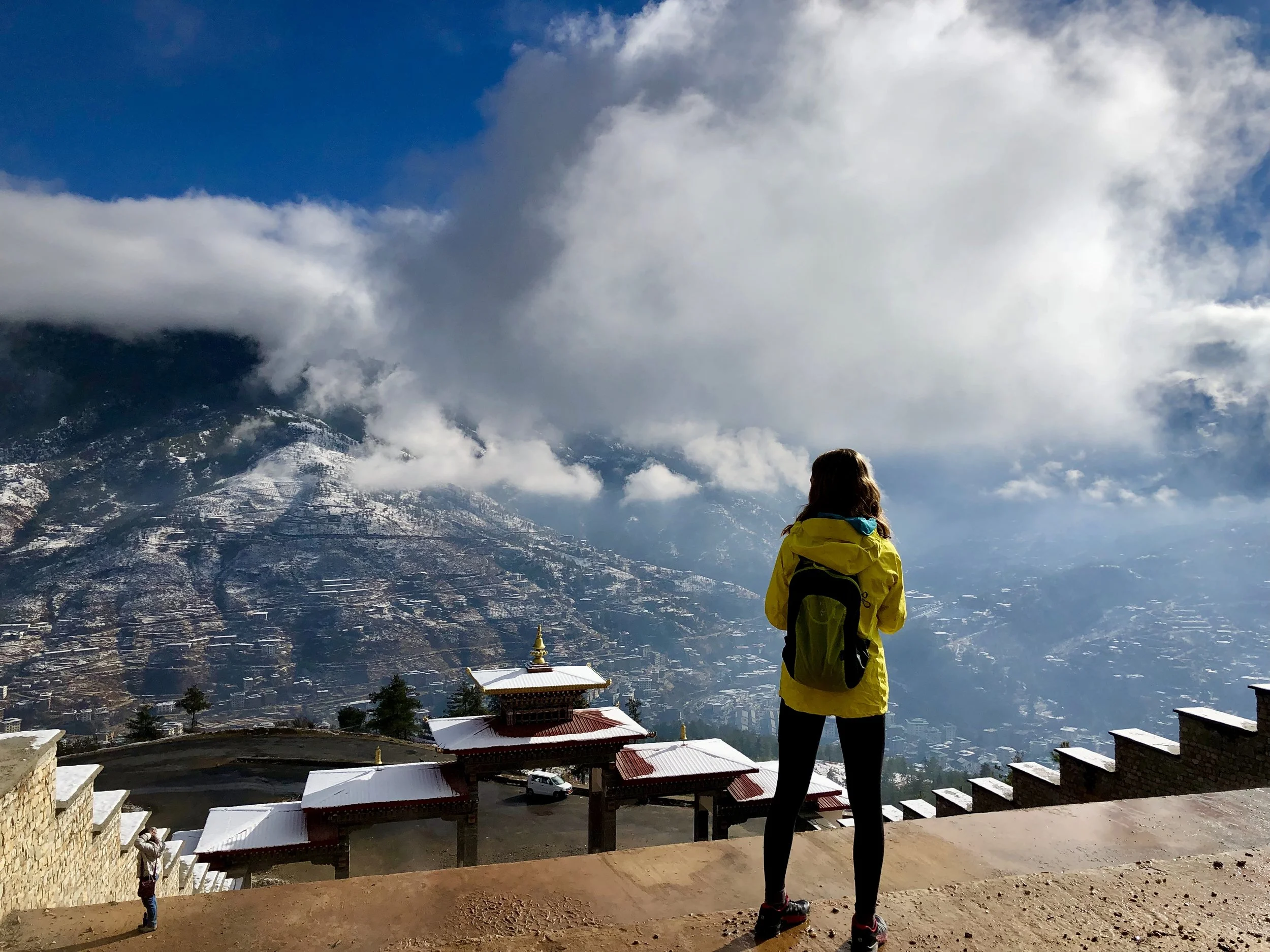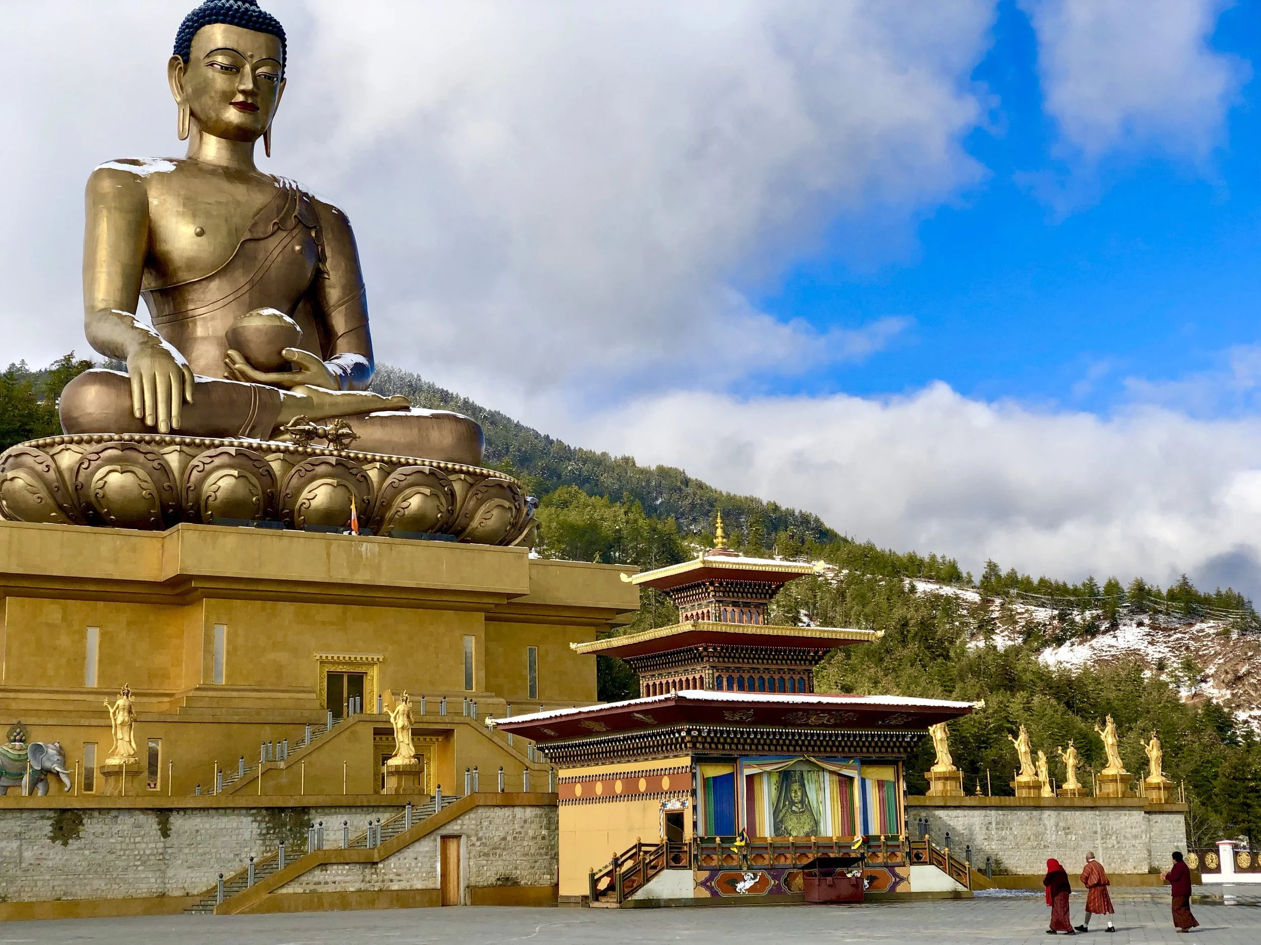 The following day we had planned to have the girls make cookies with three other girls of an expat American family who has been living here for 5 years, but the sun came out, the peaks were perfectly dusted with snow and so we headed to the Buddha on the hill and walked back to the house. The Buddha outside Thimphu is an impressive site. Gold, striking, holding a lotus flower and impossibly large it looms above the valley like a guardian of the city. The inside temple is equally impressive filled with 108 smaller buddhas and gold everywhere you look (sorry no pictures allowed inside). As the morning fog burned off the Buddha came and went until it stood cloud free, snow crusting the blue hair and painting its shoulders.