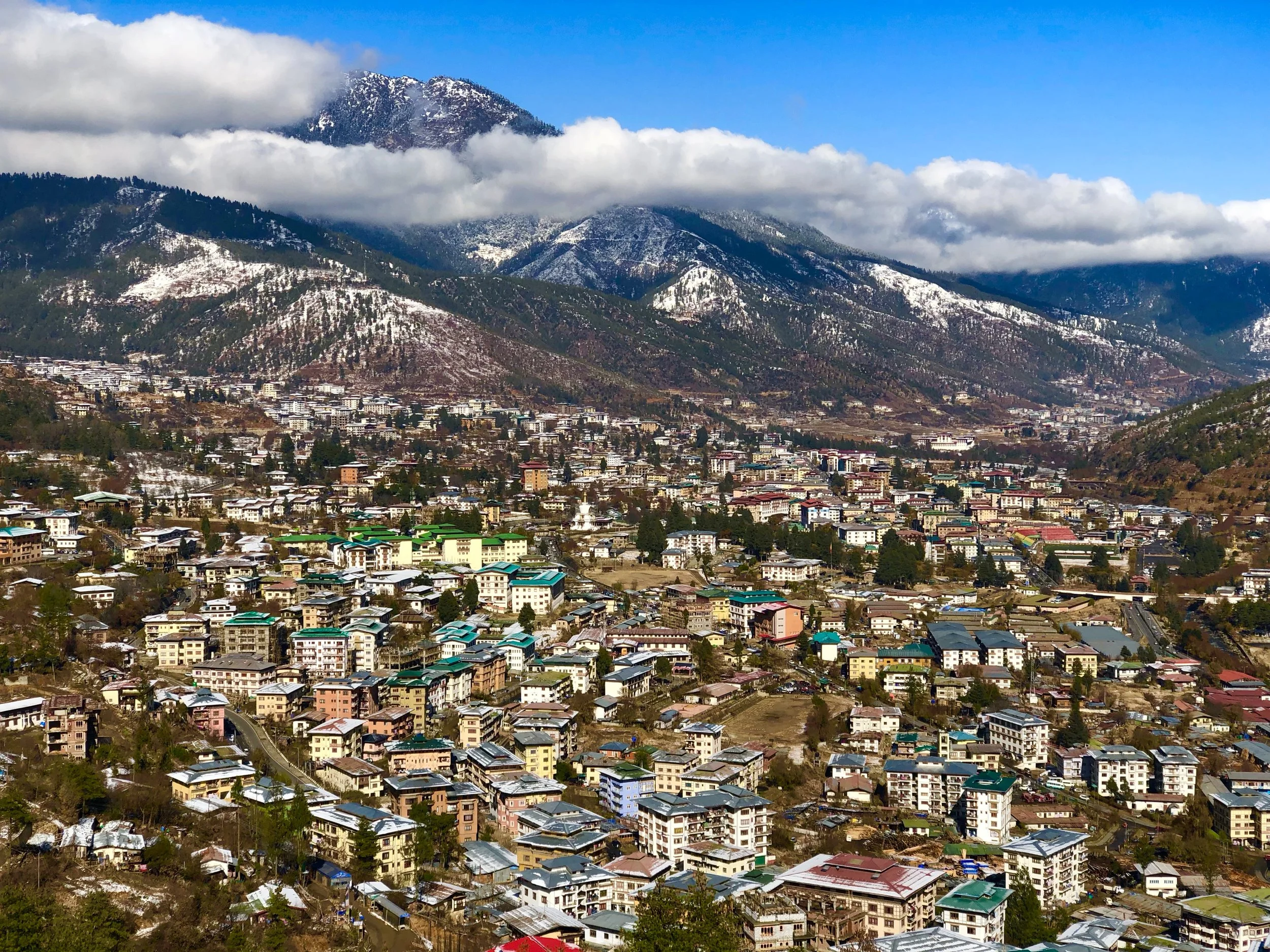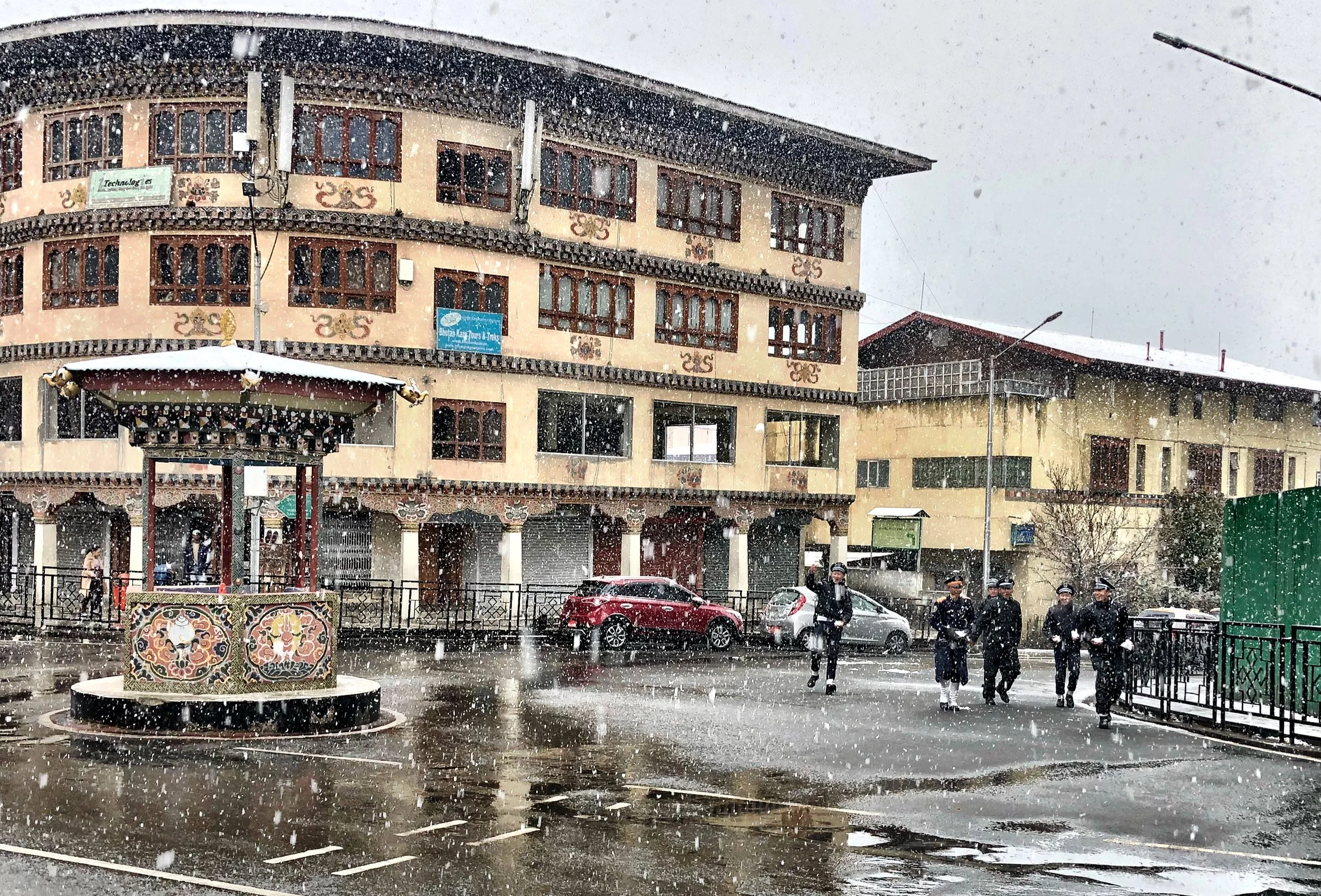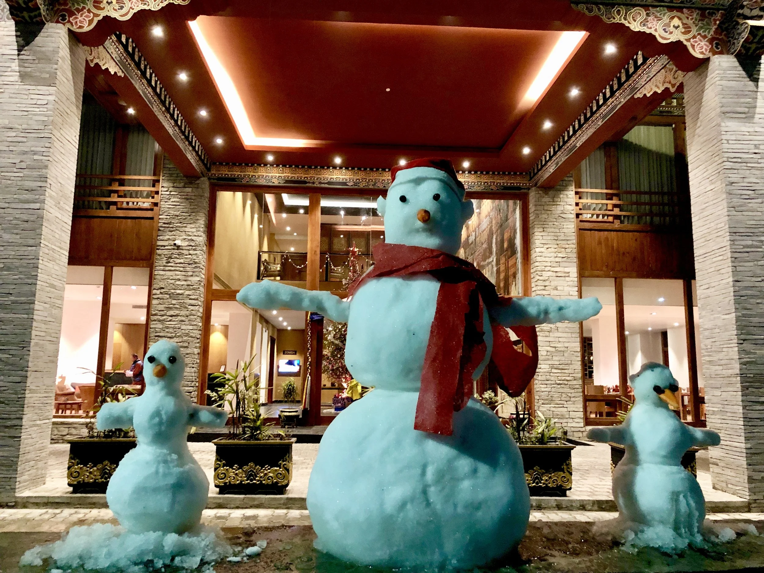 The walk into town was an adventure. Everyone was taking selfies and snowmen were appearing all across town. We got to heart of Thimphu where a sole traffic cop normally is stationed directing traffic, but this day it stood deserted. At first we were not sure what was going on, as 6 or 7 police were stopping taxis and collecting snow, then bam, a huge snowball hit me on the side of the leg. Next thing we knew we were being pelted by snowballs. Turns out when it snows in Bhutan, everyone is fair game to be pelted. As we did errands throughout the day we got better at spotting who had the snowballs, how to hide and the umbrella came in useful as a defense weapon. Everyone was grinning from ear to ear and the place was a sloppy, wet mess of fun.