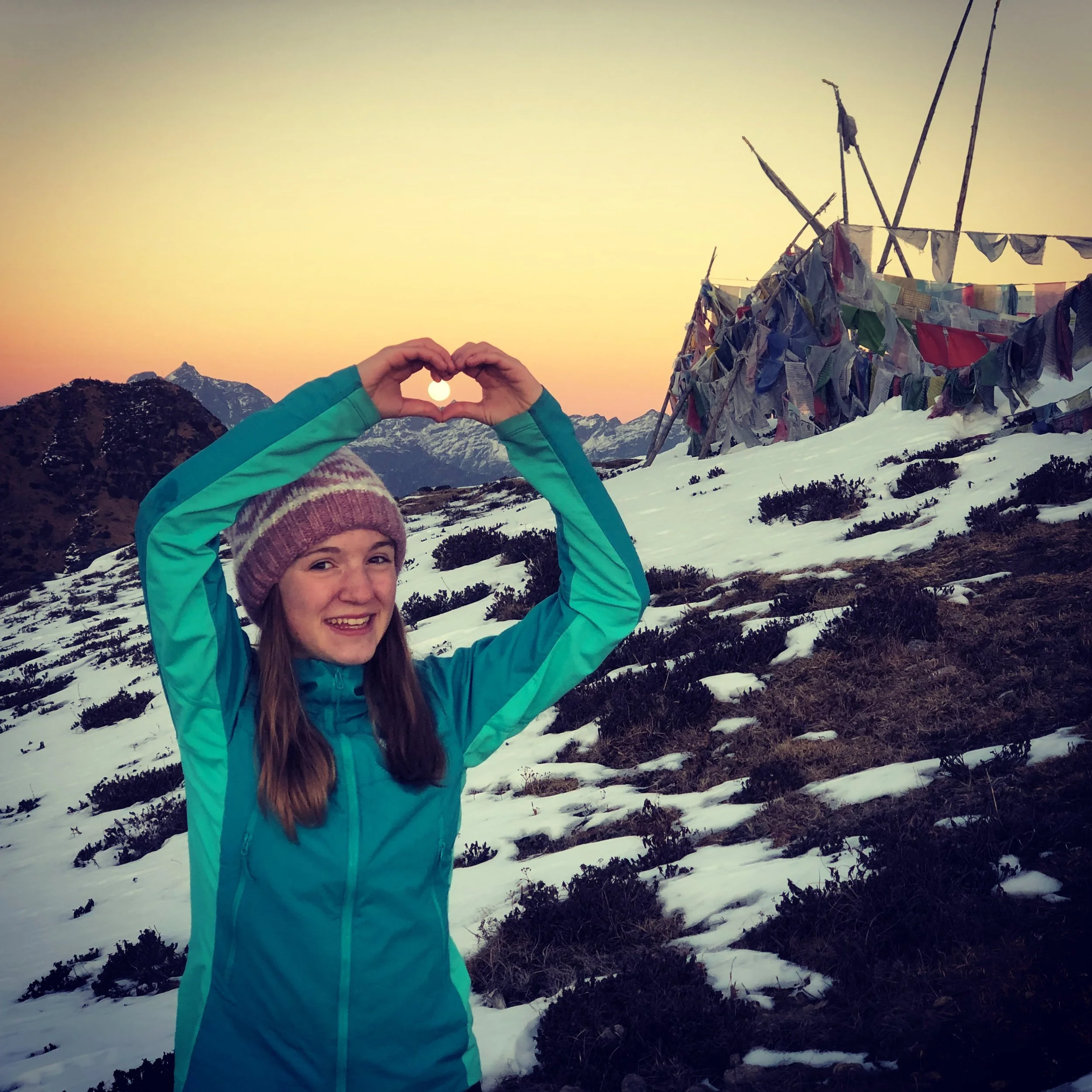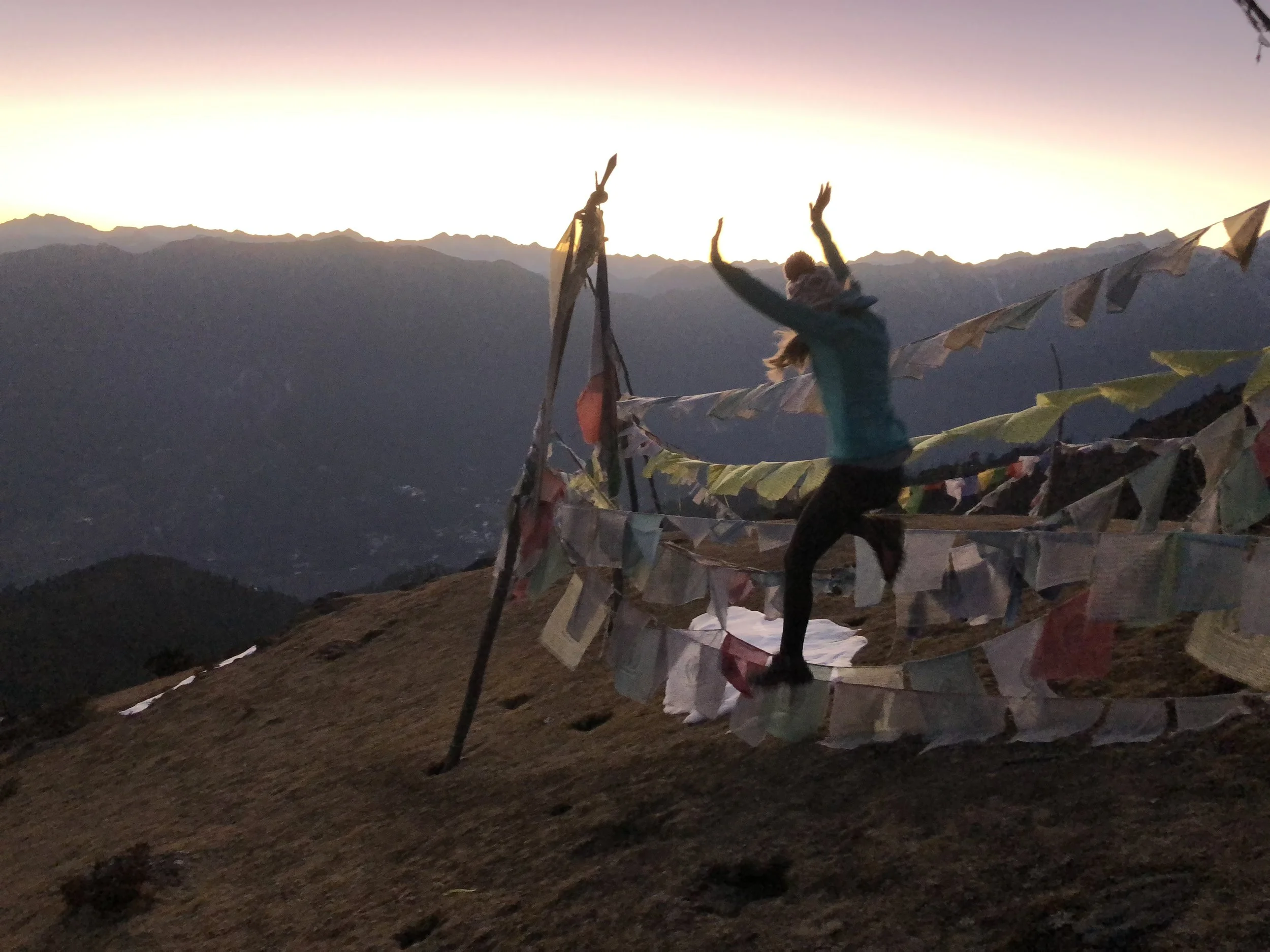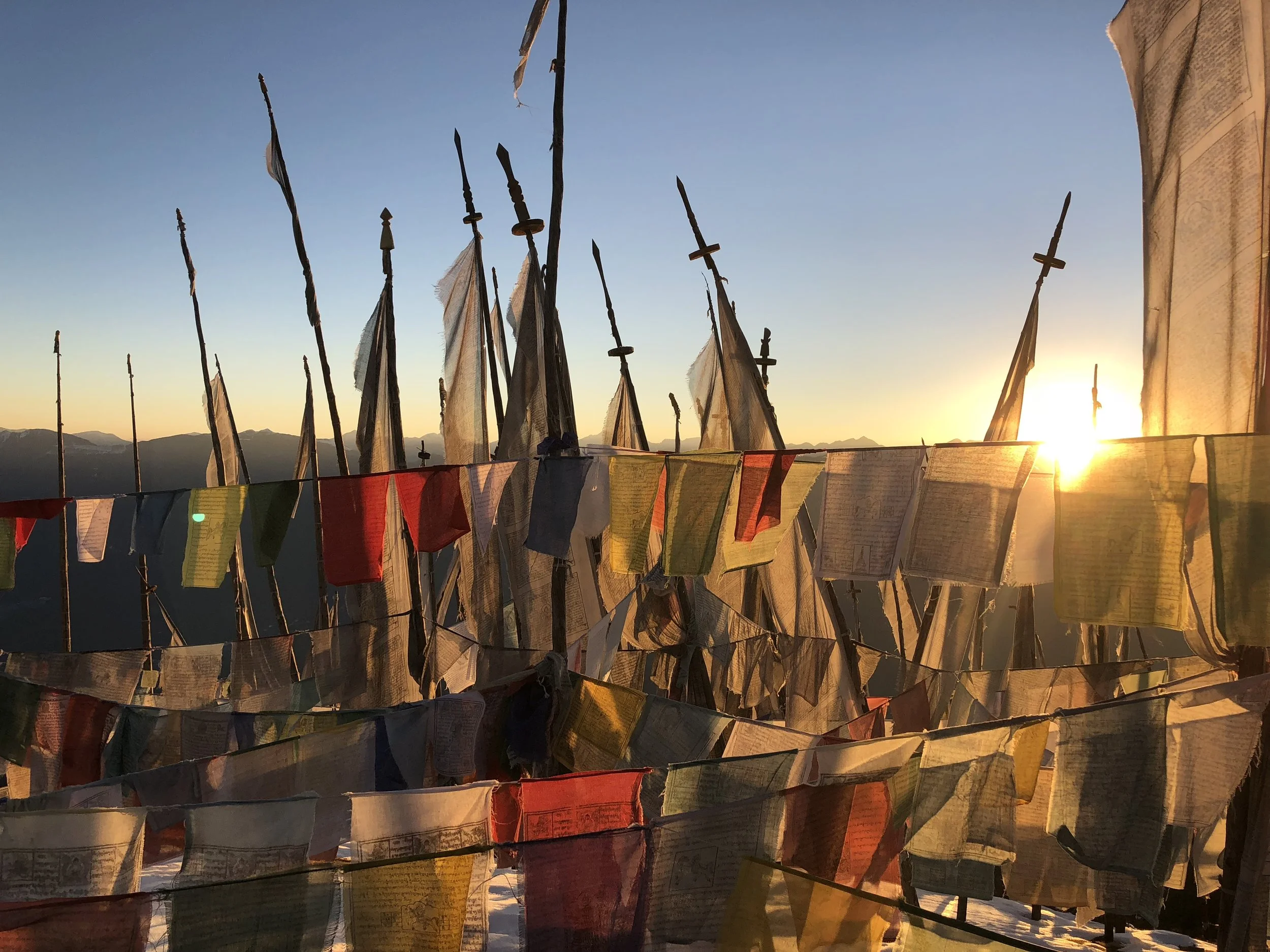 Sitting, fully enveloped by the fading prayer flags in the setting sun looking across Tibet and Bhutan and holding my daughter is a moment I will never forget. My sister and those who have gone with the God of Compassion before me felt as present as the stone I sat on, still warm from the sun in the rapidly cooling air.
