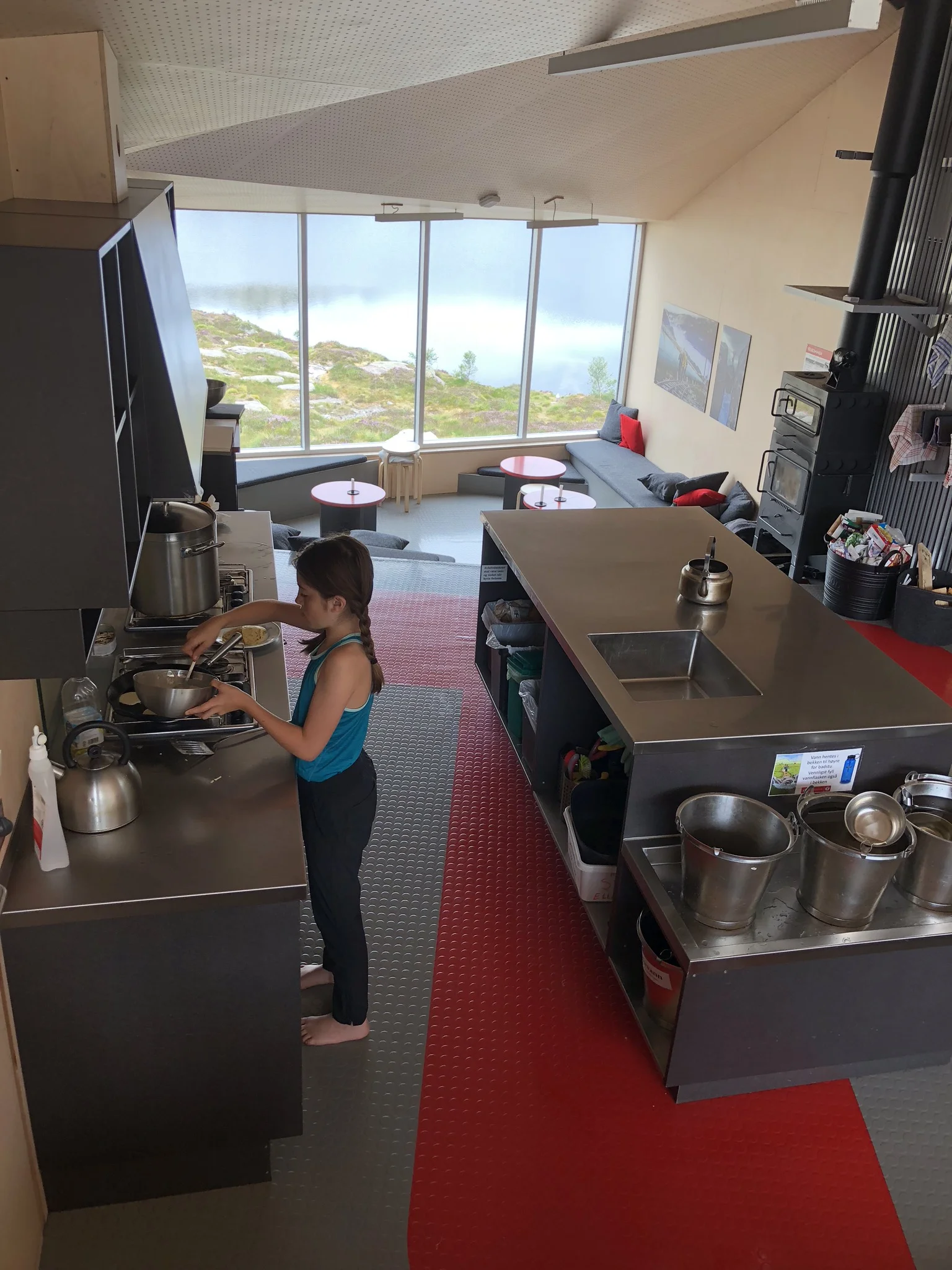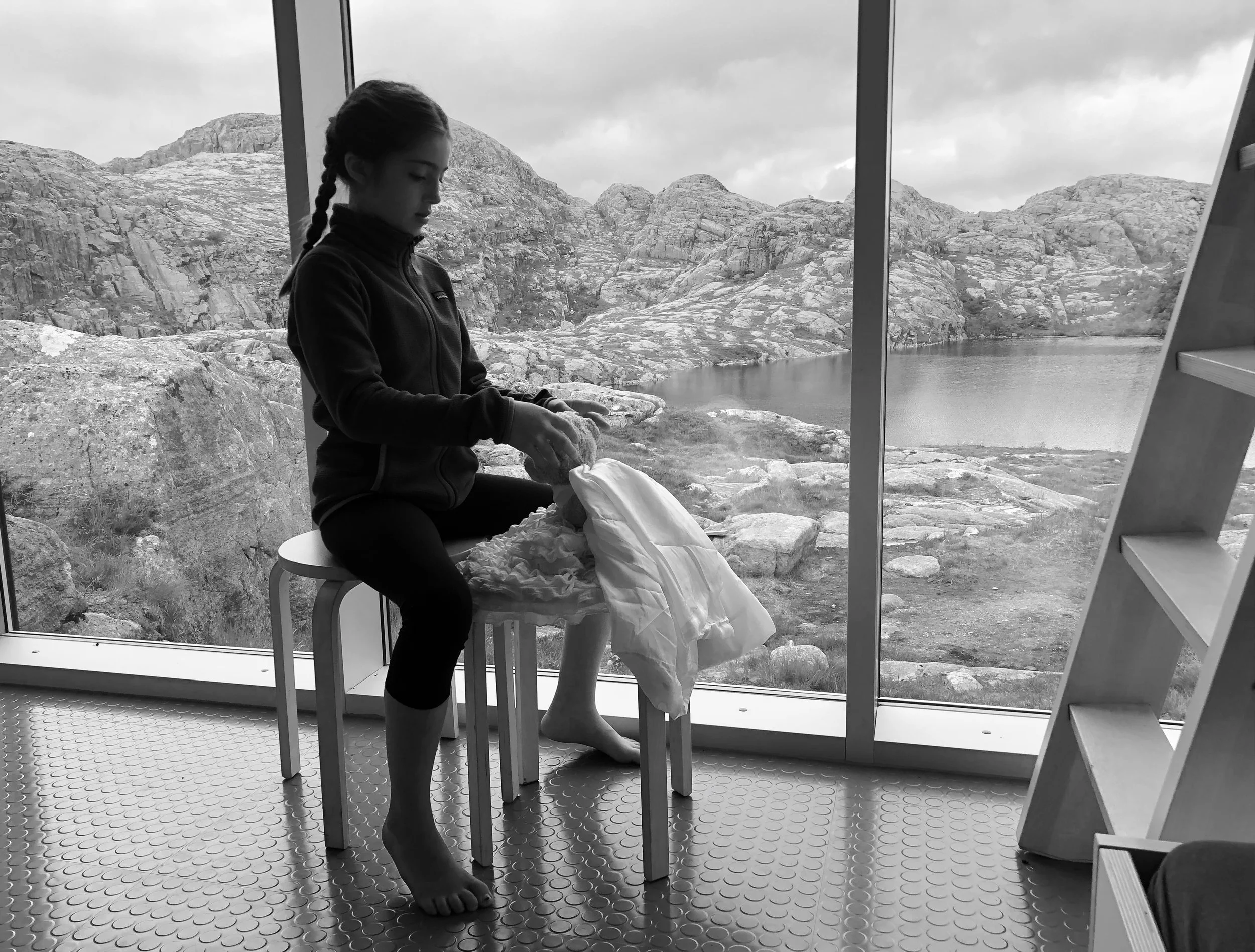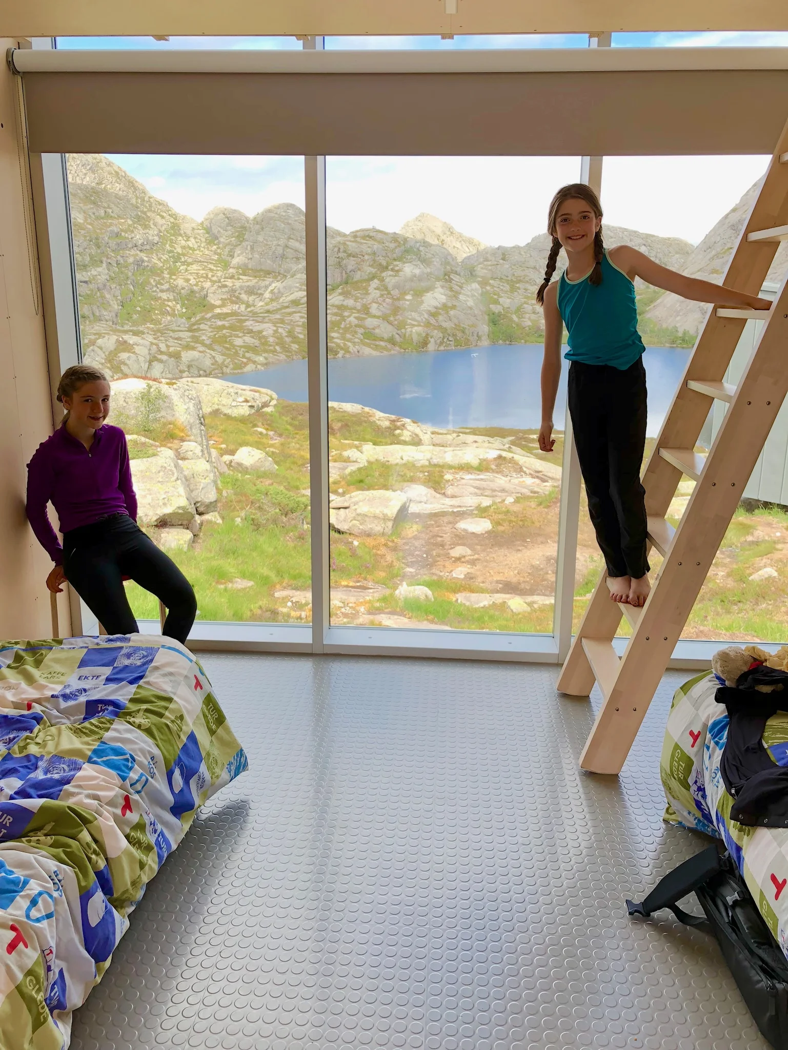The Skapet Huts are a series of 6 cabins near a main cooking/dinning area with another outbuilding (containing a latrine and supplies) and a sauna down a path to the lake. The Skapet Huts are either 2.2 or 6 miles in by hiking trail (depending on which way you come) and they are run by the incredibly efficient Norwegian Trekking Association (https://english.dnt.no). They help maintain over 500 cabins and have over 23,000 active members providing access to remote cabins in Norway which range from rustic accommodations to full service. These particular cabins were unique because they won an architecture design competition by the architects of KOKO; they are truly stunning! There were many reasons we placed these huts so high on our list. First, as a family, we seem to do best in the mountains with smaller crowds; by hiking to the huts, we could get into the mountains and have a home base from which to explore with less people around. I have also found it rewarding to stay in cabins with shared common areas while traveling with kids. You can have your own space, but you cook and interact in a main cabin area, getting to meet people from all over the world. The last reason we chose the Skapet Hutswas was because of their simple, stunning architecture which brought the outside inside. The cabins did not disappoint. They were more comfortable and more well thought out than we appreciated from the pictures and the cabins were filled mainly with Norwegians from around the country who graciously shared stories, stews and saunas with our family.