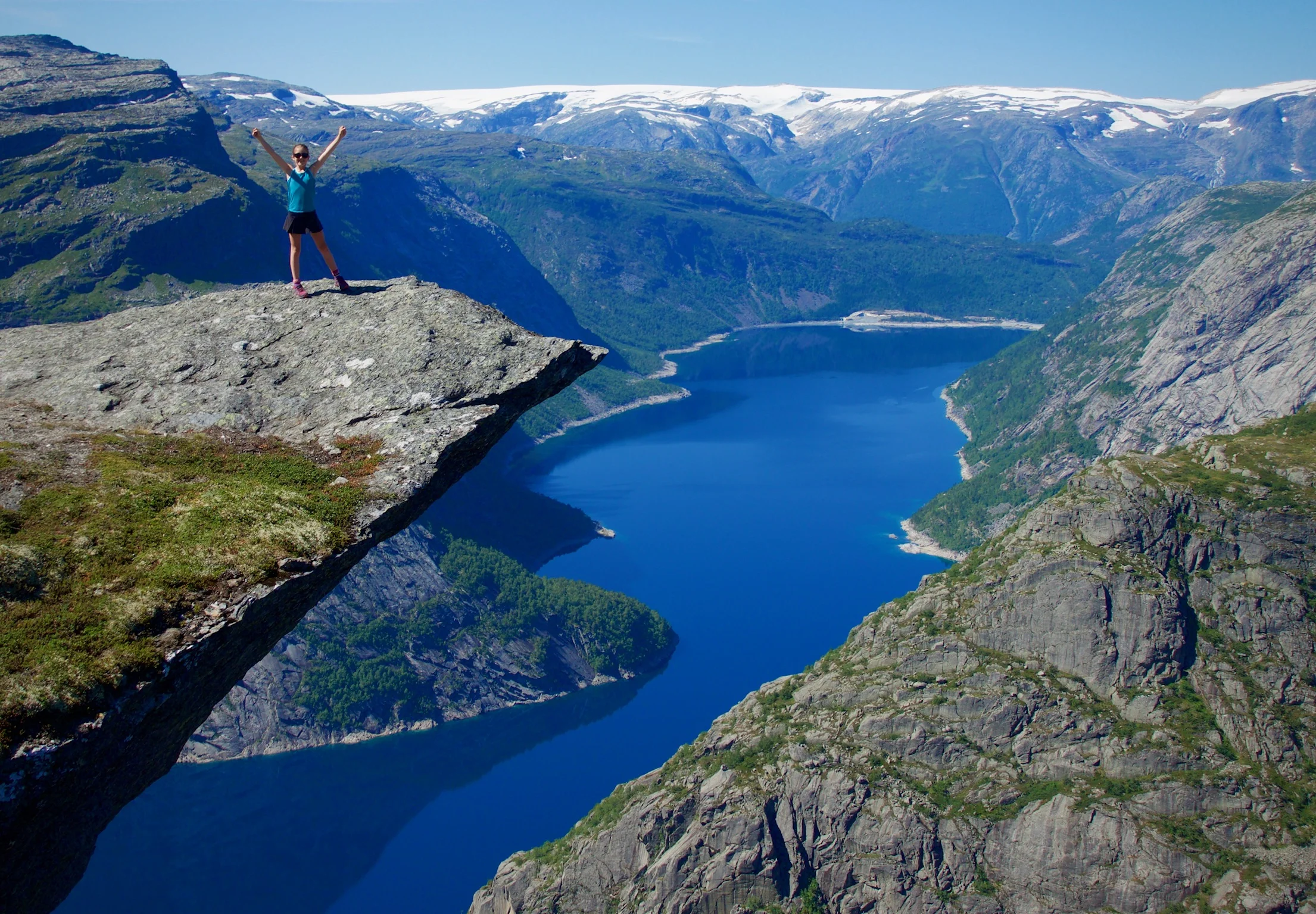 Lily with her shirt matching the incredible blue water. The pictures really did not capture the water and the sun. This was our version of the real Trolltunga which you can see in the video below. The real one is cleaner and a little longer but this area was filled with these harder layers of rock sticking out over the lake below.