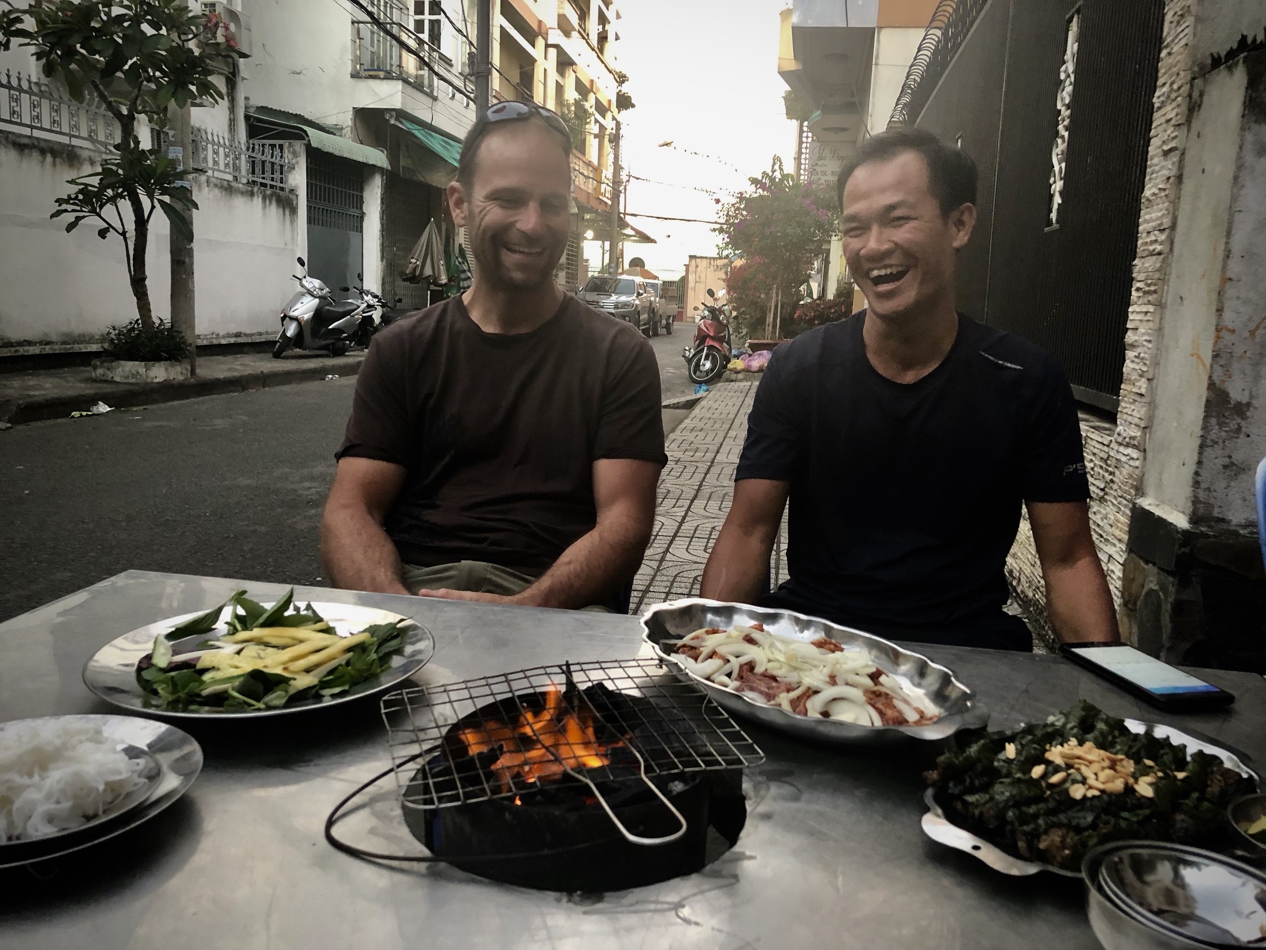 Here with our guide in Vietnam enjoying a laugh, a journey an a shared meal over pots of charcoal at the tables.
