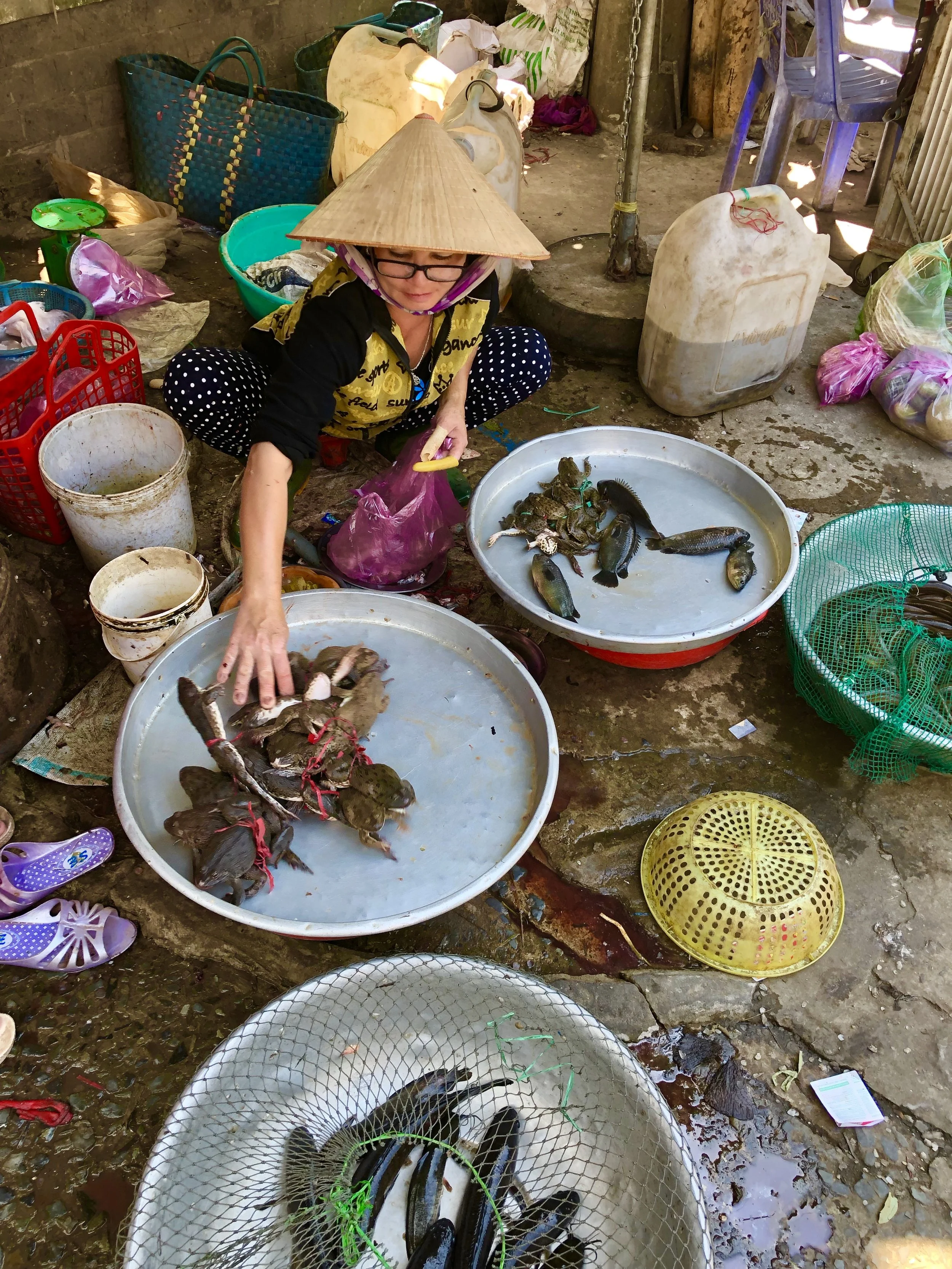 Live eels and frogs for sale. The frogs were all tied together by their waist so they all were jumping against each other - preventing any one of them from escaping.