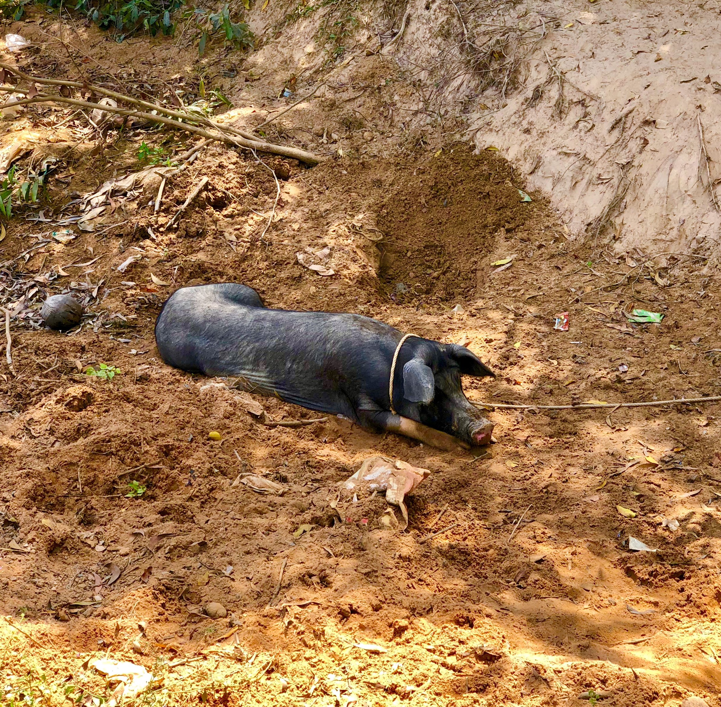 It seemed like in most towns you would see the town pig trying to find some place cool.