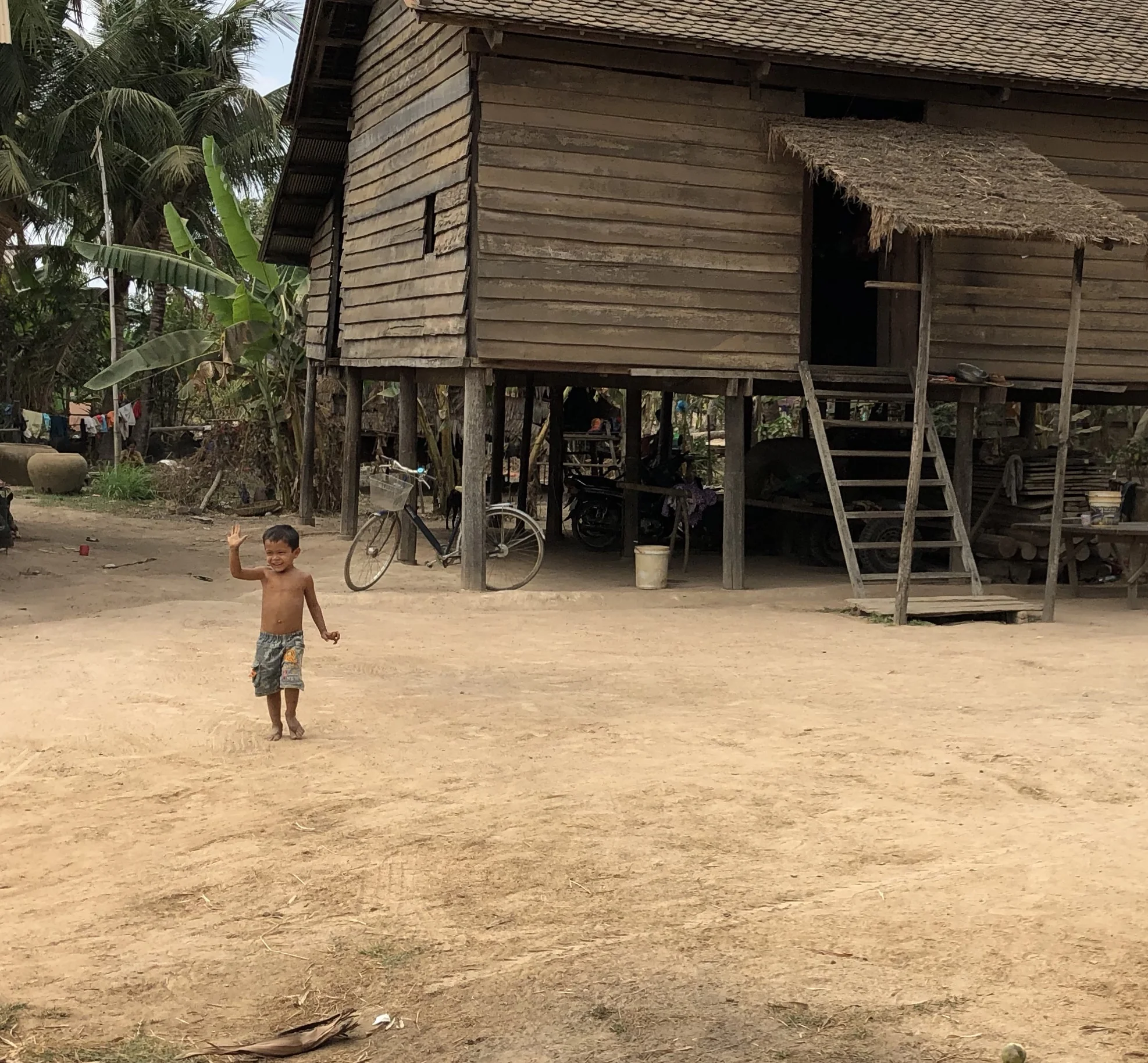 One day visiting a temple that we were biking past and trying banana root that is in season only for a short time each year, this little one sat down next to me and started talking up storm. When I offered her some banana root, she kept looking at me puzzled, but all smiles.